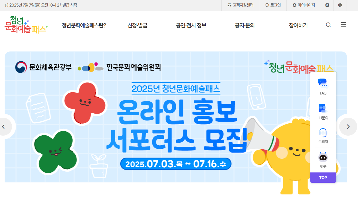 청년문화예술패스 홈페이지